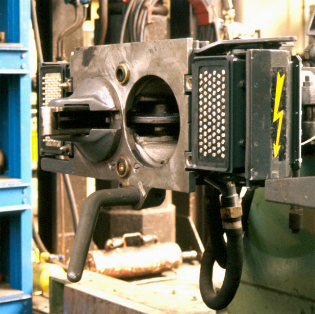 <<< Spoorwegmuseum, 9 juni 1973. Opengeklapte Scharfenbergkoppeling van treinstel 27. Duidelijk te zien zijn de koperen contacten die voor de elektrische verbindingen zorgen.